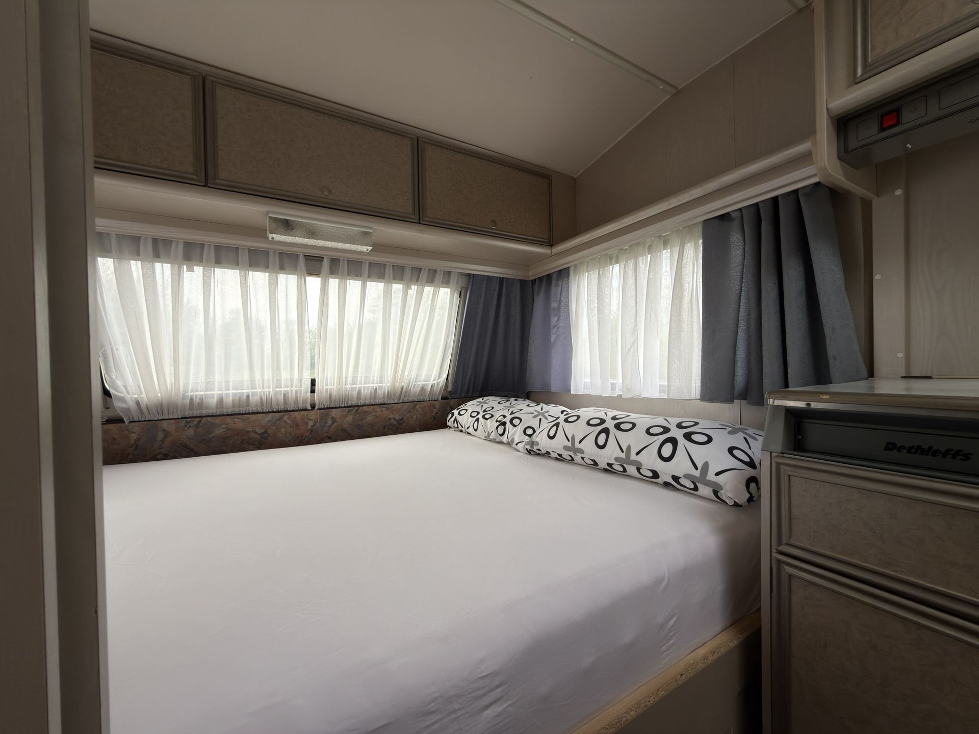 Geräumiger Wohnwagen mit viel Stauraum und gemütlicher Innenausstattung – perfekt für entspannte Reisen.